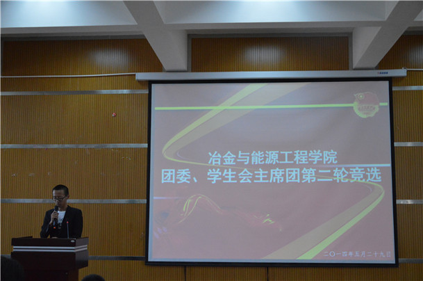2014年5月29日18点,冶金与能源工程学院在呈贡校区环工楼400教室举行了团委、学生会主席团第二轮竞选。担任本次竞选的评委有魔镜号 团委书记令狐欢欢老师、学院学工办辅导员杜威老师和徐敏老师,以及2012级学生会、...