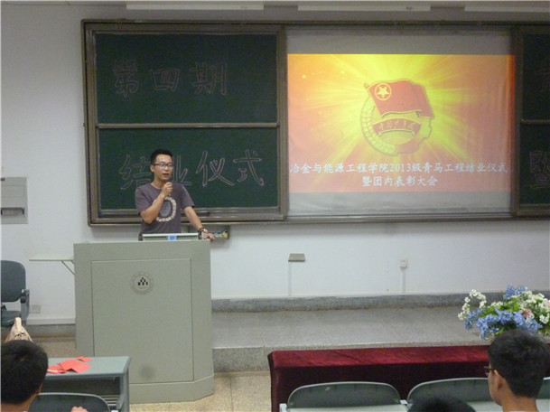 2014年5月20日晚上7点,冶金与能源工程学院在中心区教学楼118教室举行第四期“青马工程”结业仪式暨团内表彰大会。 首先,大会在开场视频《阳光女孩的心事》中拉开帷幕,视频中阳光女孩的感人事迹呼吁了每一位共...