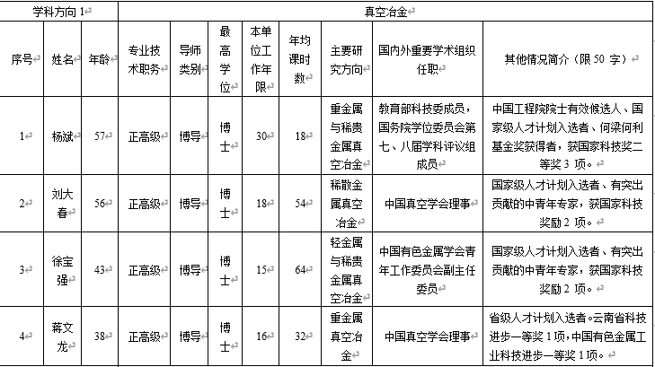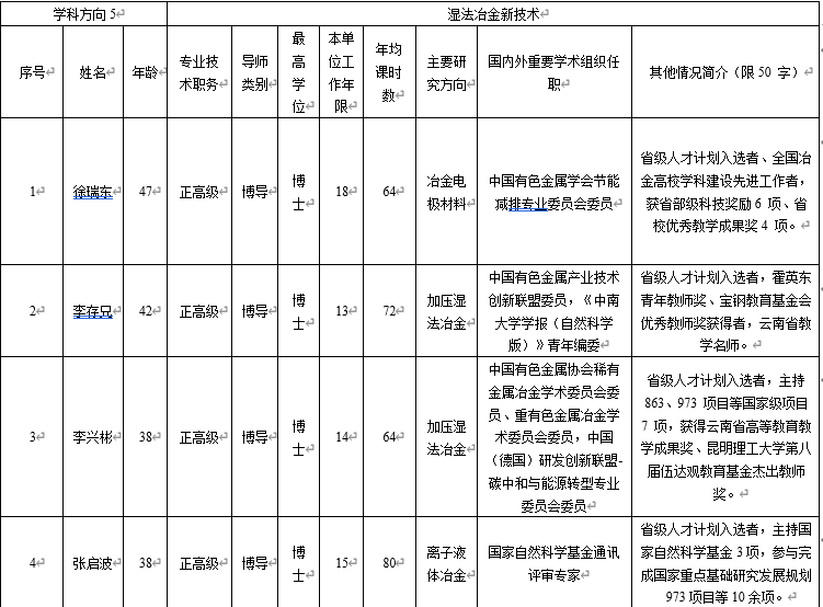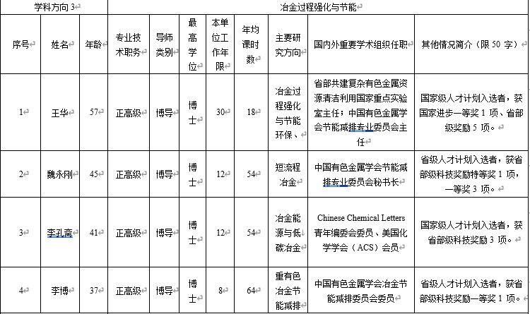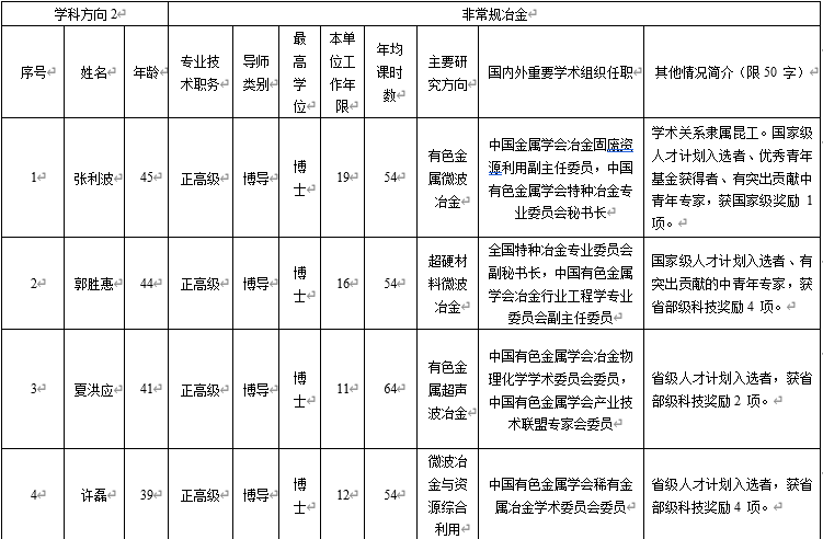 特色鲜明、实力雄厚。本学科立足我国西部地区,依托区位优势和有色金属资源储量丰富特色优势,形成真空冶金、非常规冶金、冶金过程强化与节能、新能源电池及材料、湿法冶金新技术5个特色学科方向,研究水平国际领先。现有专任教师146人,包括国家级高层次人才11人;拥有真空冶金、冶金节能减排等国家级创新团队3个、国家教学团队1个,省创新团队7个;建有省部共建复杂有色金属资源清洁利用国家重点实验室、真空冶金国家工程研究中心、复杂有色金属资源综合利用省部共建协同创新中心等国家级创新平台9个和省部级创新平台29个;建成干勇、何季麟、张文海、张懿等9个院士工作站。