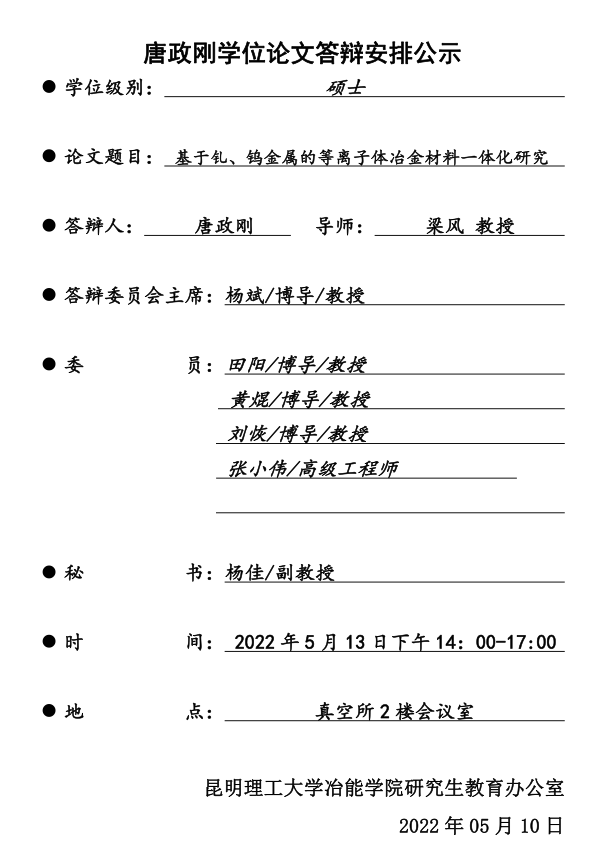 魔镜号 硕士学位论文答辩安排公示——唐政刚——2022-05-13