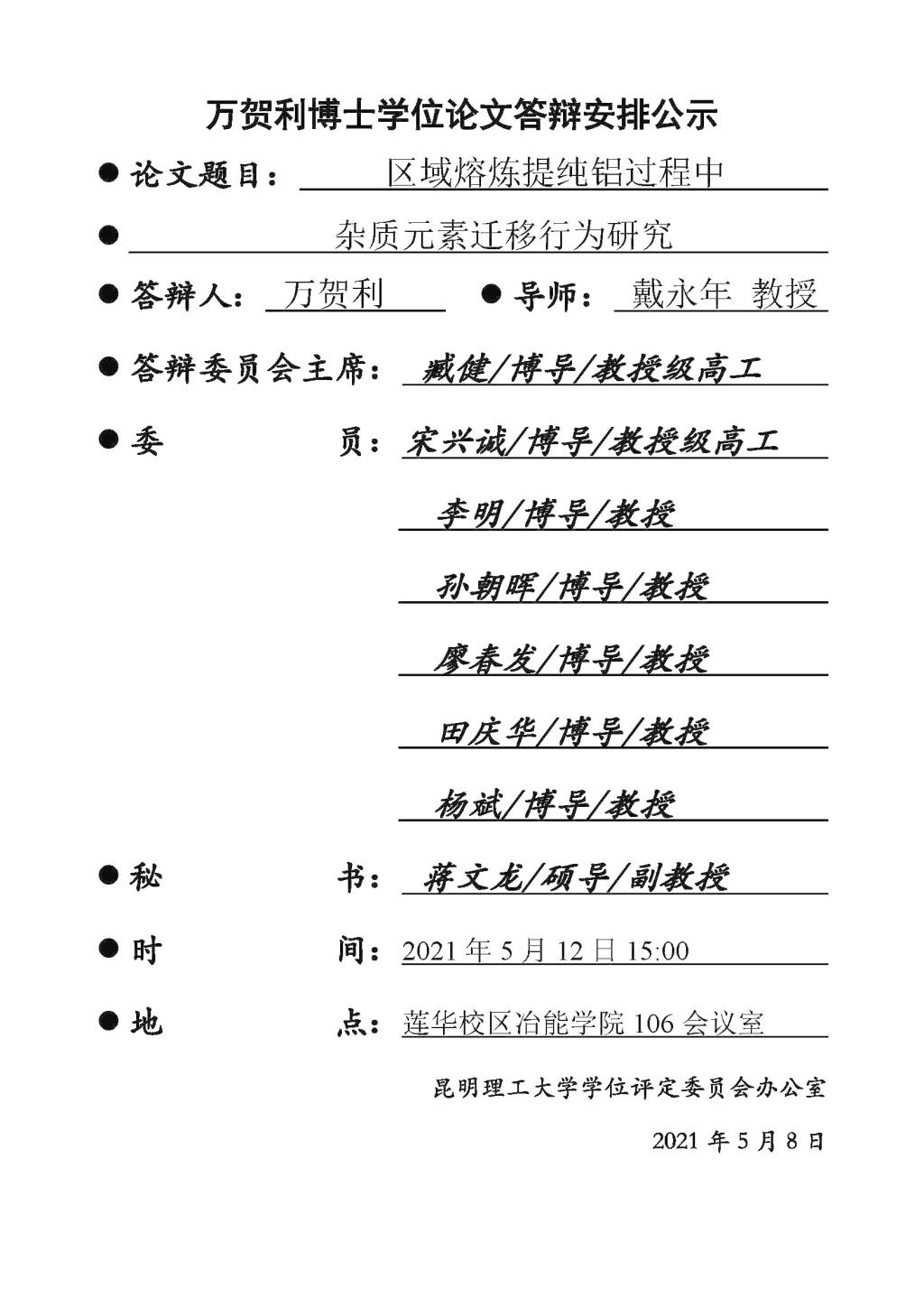 冶能博士学位论文答辩公示--万贺利2021,5.12