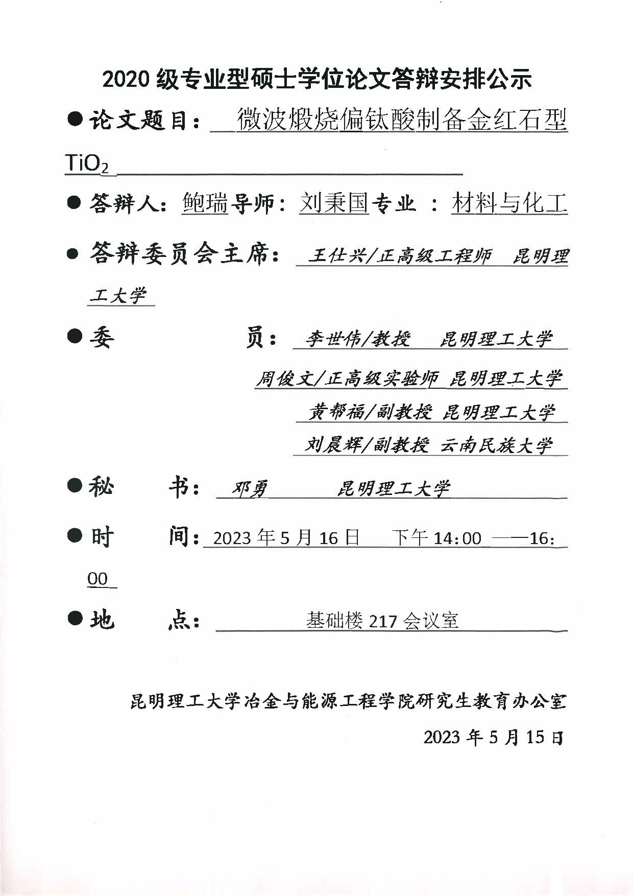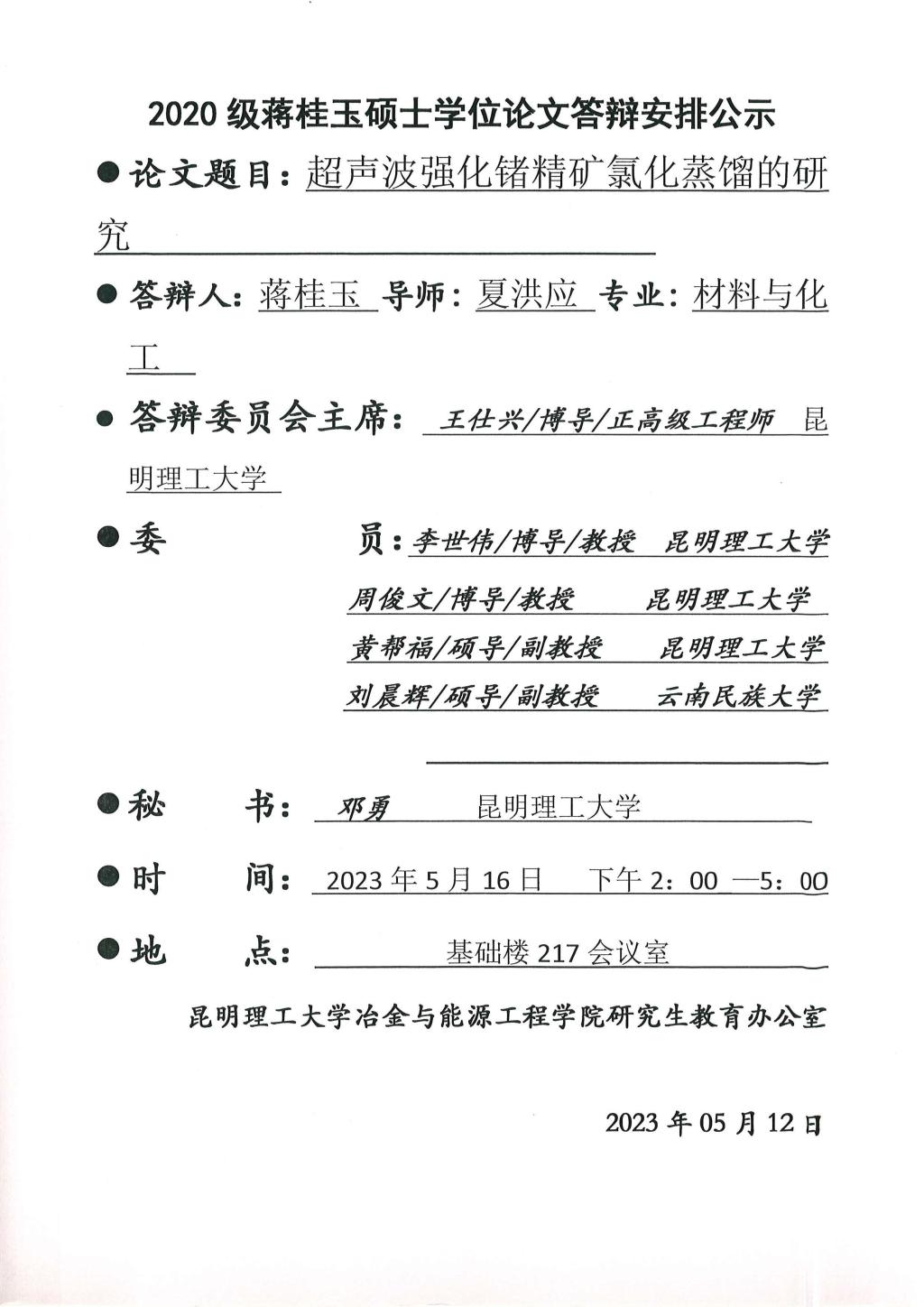 硕士学位论文答辩公示——李蕊,陈昌明,徐文琳,王红玉——2023.05.14