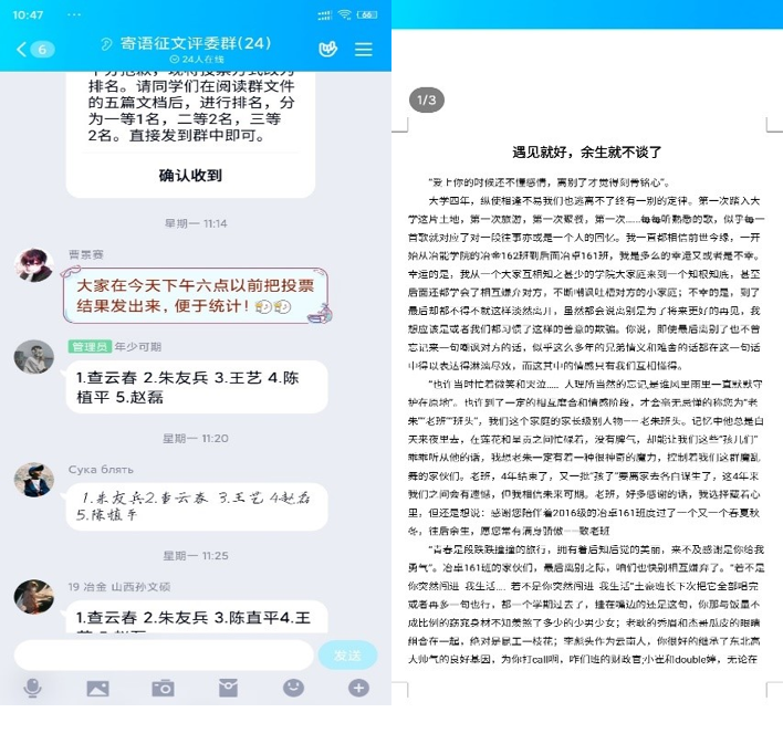 活动期间,主办部门积极组织,参赛选手积极参与,其中不乏有许多优秀获奖作品的产生。参赛学生感悟颇多,有对学校的离别之语,决心牢记校训“明德任责,致知力行”四字箴言。有对老师的临别寄语,一句“老师,您辛苦了!”展示浓浓师生情。还有对学弟学妹们大学生活经验的分享,展现学院同学情义。以上种种无不表达毕业生们对母校对学院对师生的不舍。活动后期,为保证比赛的公平性,学生会积极组织人员组成评选组,进行评选。最后,冶金卓越161班查云春获得一等奖。
