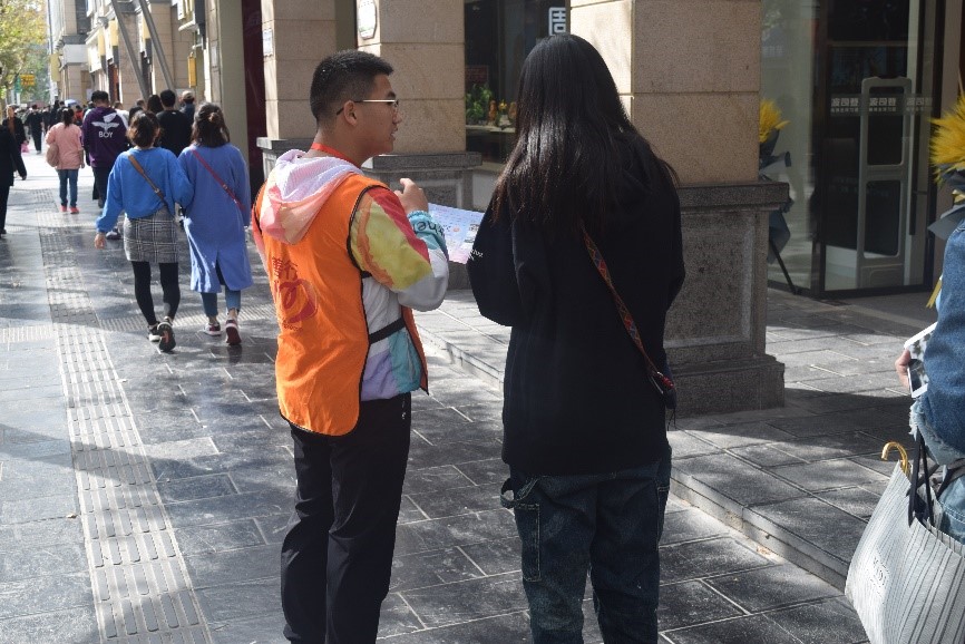 上午8:00同学们在憬园集结一同出发前往目的地,开始了一天的募捐活动。这周是同学们展开的最后一周“善行100”活动了,我们的志愿者更加珍惜这次机会,做好了充分准备,心里满怀期待同时也有很多不舍。在前两次的经验积累下,本次募捐活动轻松了很多,同学们分成两组,分别在正义路和世纪俊园熟练地向路人们讲解了活动的意义和不同类型的爱心包裹。