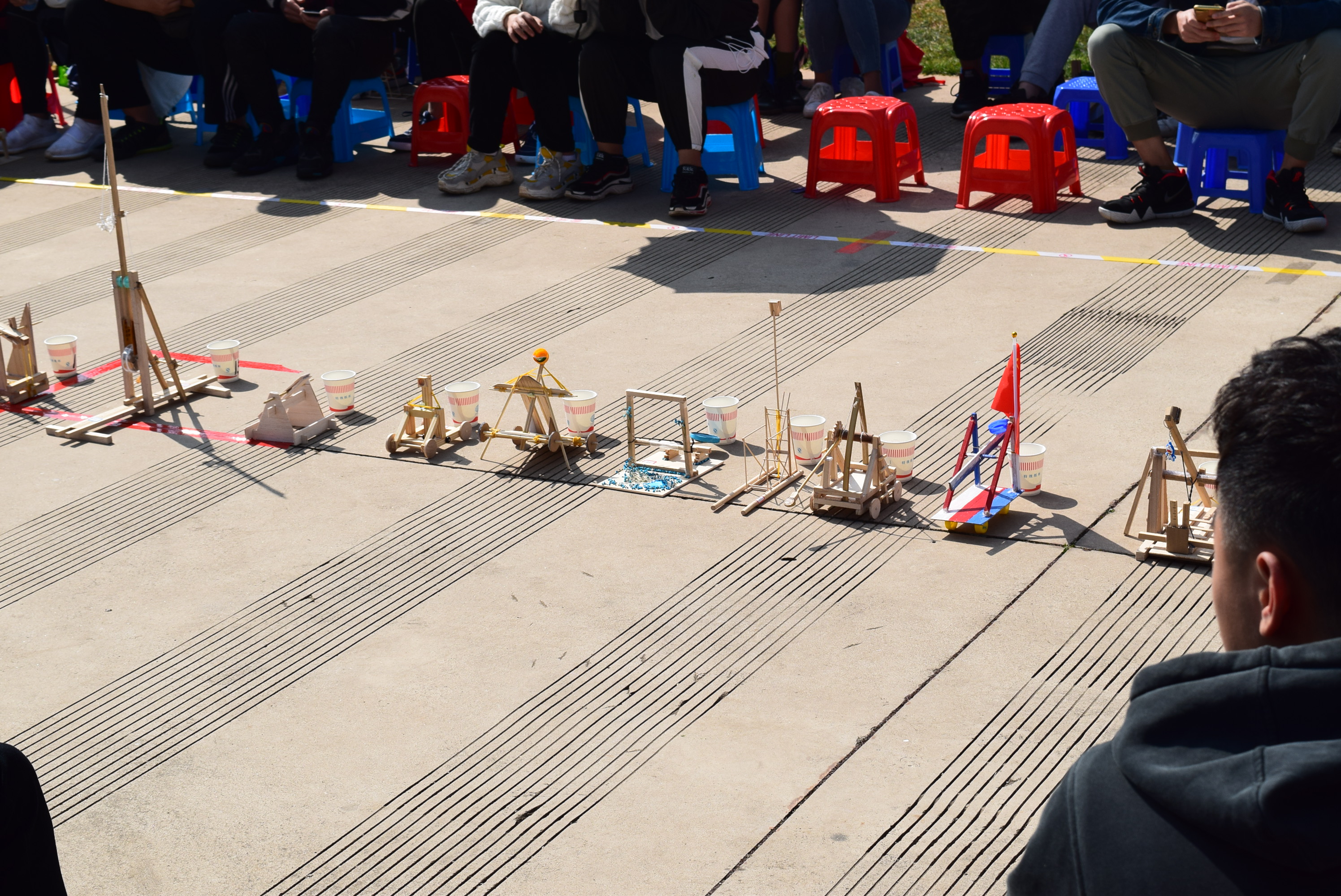 此次大赛主要分为美观组和竞赛组,首先进行的是美观组的比赛。参加美观组竞赛的选手把作品集中放在比赛场地中央,由现场观众及参赛组选手为作品进行投票,参与投票的人员有序排队上场将自己手中宝贵的一票投给心仪的作品,投票结束后将由工作人员进行票数统计,统计结果会在比赛结束后统一公布。随后进行的是竞赛组的比赛,本次比赛采用的是计分制,每支参赛队伍有三次弹射机会,最后得分为三次弹射环数的总和。比赛开始前,每支队伍有一分钟的调试时间,然后比赛正式开始。为了保证比赛的公平公正性,魔镜号