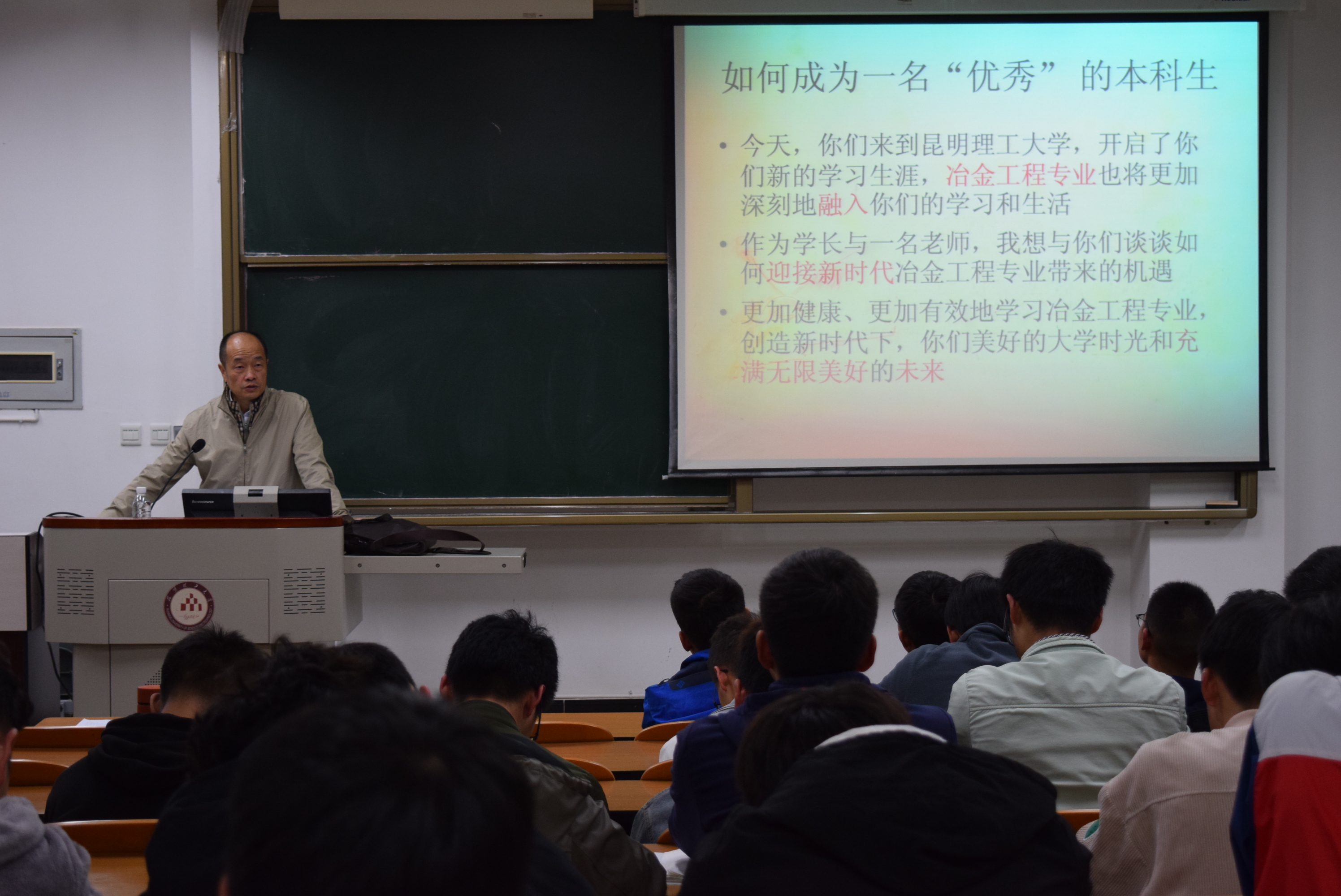 魏昶教授以学院冶金专业的历史以及学院冶金专业培养了大批的优秀毕业生开始了本次讲座。魏教授结合自己的亲身经历告诉大家:“你们作为冶金专业的学生,要对专业自信,冶金专业未来的发展趋势依然很好。”接着,魏教授又通过国学知识引入“自强不息”一词,深入浅出的解释分析,告诫在座的学生应当自强不息。魏教授提出:“如何成为一名优秀的本科生?”新时代的大学生,应当先学做人,注重个人的自我修养、品德;学习上要有恒心,不断坚持并且积极探索新时代适合自己的学习方式。在新时代新的教学实践模式下,所有人都应当更加自觉,更加主动,充分利用好学院现有的科研平台、各种资源,为自己的未来奠定基础。追求卓越,共创一流,与教师一起推动教与学的创新发展!