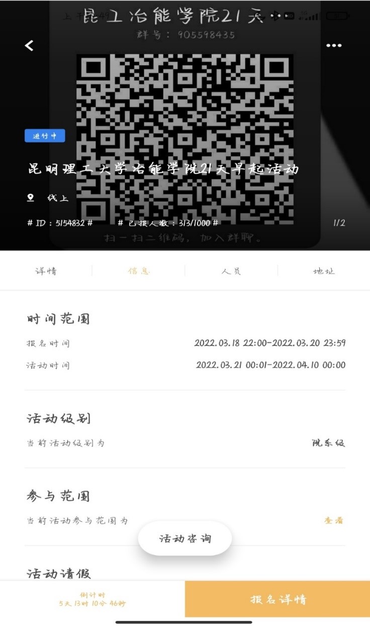 2022年3月21日至4月10日,冶金与能源工程学院开展“一日之计在于晨”21天早起线上打卡活动,旨在提高同学自律性,培养规律作息习惯。