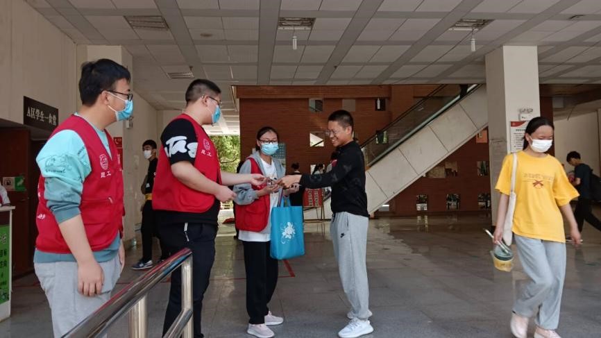 接到招募令后,同学们踊跃报名。轮值当天,志愿者们规范服装,做好个人防护,分别在憬园、怡园两个园区的多个食堂门口进行值守,监督提醒进入食堂就餐的师生佩戴口罩,为对未佩戴口罩的老师和同学发放口罩。