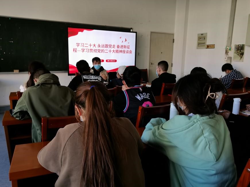 2022年11月17日下午,冶金与能源工程学院团委在管经楼104-2教室召开学习贯彻党的二十大精神座谈会。学院团委书记崔庆宇主持会议并领学党的二十大精神,辅导员裴宇婷和全体团学干部参加会议。