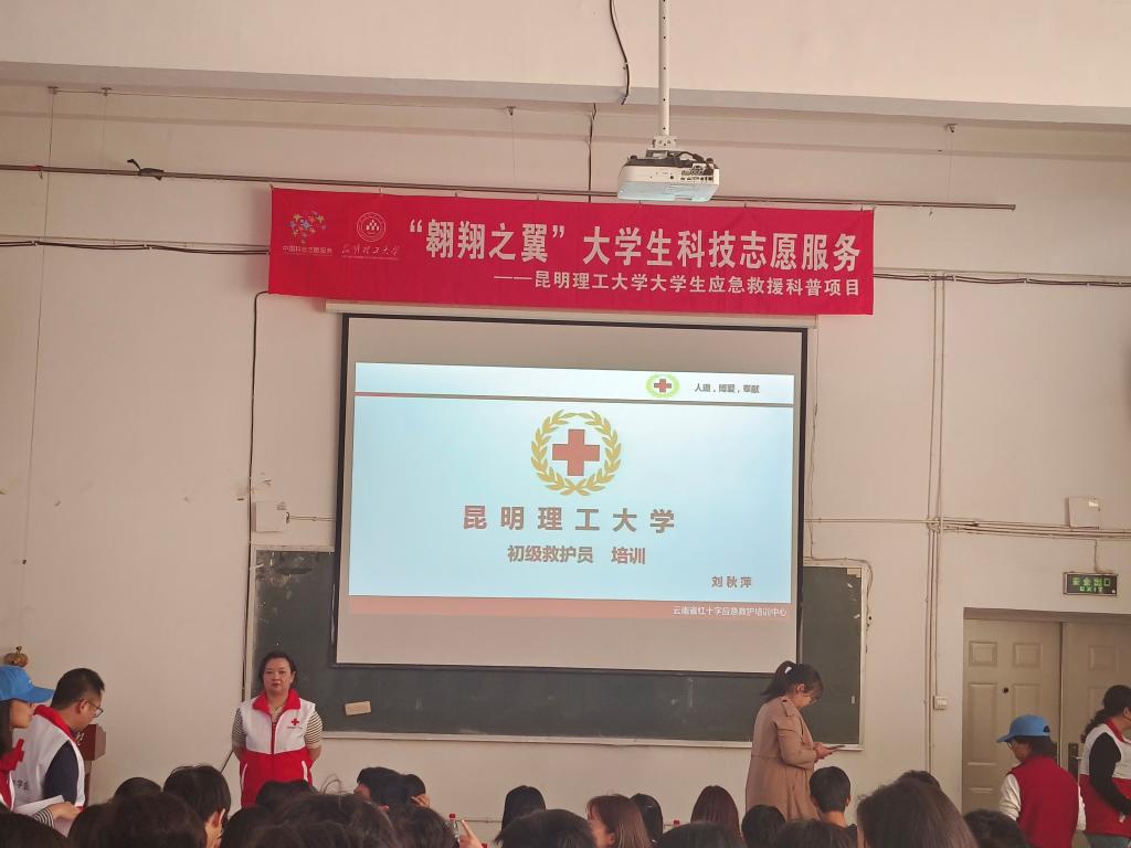 本次活动包括理论课程培训与考核、实操讲解与考核、颁发证书三部分。上午通过云南省红十字会成员的讲解以及观看相关视频,同学们学习了红十字基本知识,以及心肺复苏、AED、气道异物梗塞、创伤救护的相关救护知识,并参加了理论考核。