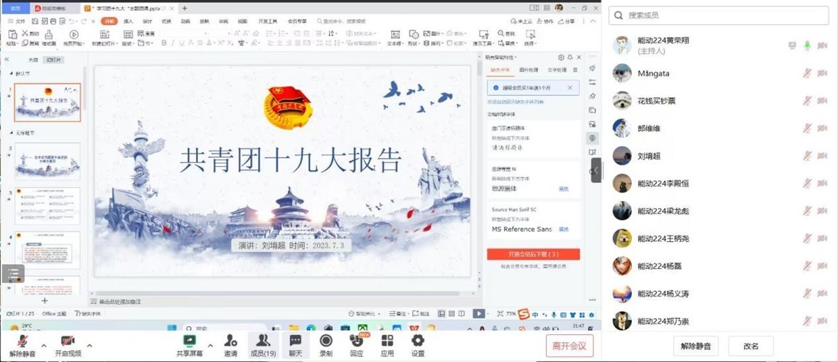 学院团支部结合自身实际,通过线上观看共青团十九大开幕会、组织交流分享会等创新形式,深入学习宣传贯彻习近平总书记在同团中央新一届领导班子成员集体谈话时的重要讲话精神,深刻领会党中央致词精神,结合《习近平著作选读》《论党的青年工作》《习近平与大学生朋友》等生动素材,结合正在开展的主题教育进行学习,深入领会贯穿其中的思想内涵、精神要义和实践要求。本次活动中,冶金工程专业2021级菁英班团支部、能源与动力工程专业2022级4班团支部等团支部,通过高唱国歌、团歌、学习团十九大报告以及团章修改情况等形式,引领团员青年更加深化对“两个确立”的政治认同、思想认同、理论认同、情感认同,不断增强做到“两个维护”的内在自觉,为中华民族伟大复兴的中国梦贡献青春力量。