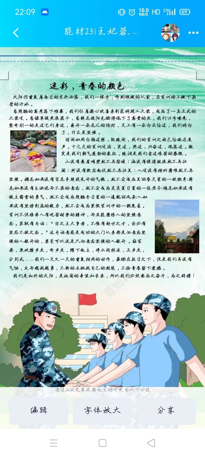 本次活动以线上方式进行,参与同学以”以军魂之魄执笔,共续热血青春华章”为主题,撰写200字左右的军训感言,分享军训的美好瞬间,并记录军训时的体会。同学们积极参与,收到参赛作品67份,评出一等奖、二等奖各三人,三等奖四人。