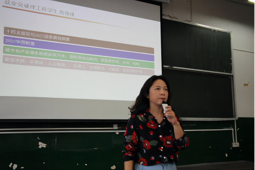 首先,洪云主要针对学生现在普遍存在的慢就业现象进行解读,让学生通过了解自己,了解当下的就业形势,调整自身状态,理性寻找就业出路。她从外因和内因两方面对当前就业难度入手,分析了未来的就业形式和就业方向。随后,洪云从求业者和用人单位的角度,围绕技能匹配、价值观支持和兴趣助攻三个核心,根据个人职业定位以及各地人才需求,与同学们分享了精准而高效的求职路径。同学们反响热烈,踊跃交流,受益匪浅。
