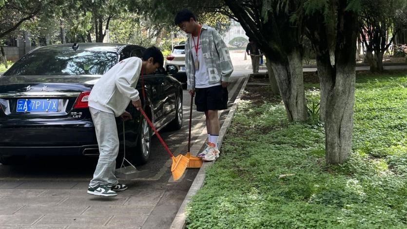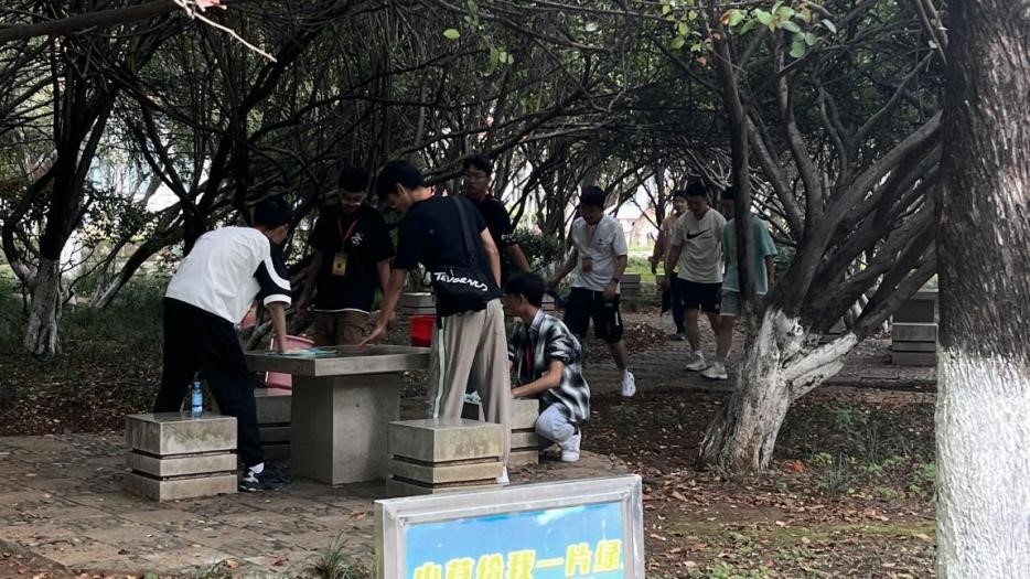 活动当天,同学们提前到达清扫现场,明确分工后,认真清理打扫卫生、捡拾垃圾、清洁石凳石桌。劳动现场热火朝天,志愿者们高效协作完成任务。