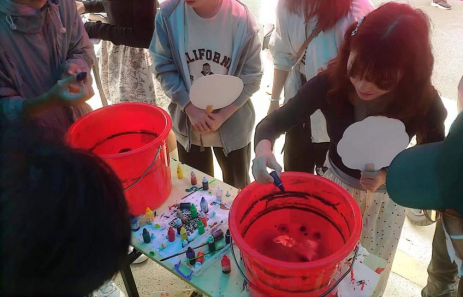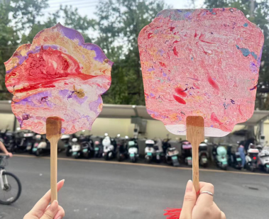 漆扇是一种古老的艺术品,使用了漆艺中的“漂漆”技法。利用漆不溶于水的特点,将各种颜色的大漆颜料滴入清水,再用特殊的技巧将扇子浸入水中,从而得到花式各异的图案。活动现场,同学们在工作人员的指导下将各色彩漆滴入水中,搅动水流形成各种图案,再将扇子浸入水中。大漆的色彩附着于扇面,形成多姿多彩的图案,赋予了每把漆扇独特的灵魂。现场还有同学使用笔墨在扇面上题字,一笔一划之间尽显古韵之美。本次活动反响热烈,同学们踊跃参与,制作了一件件精美的作品。