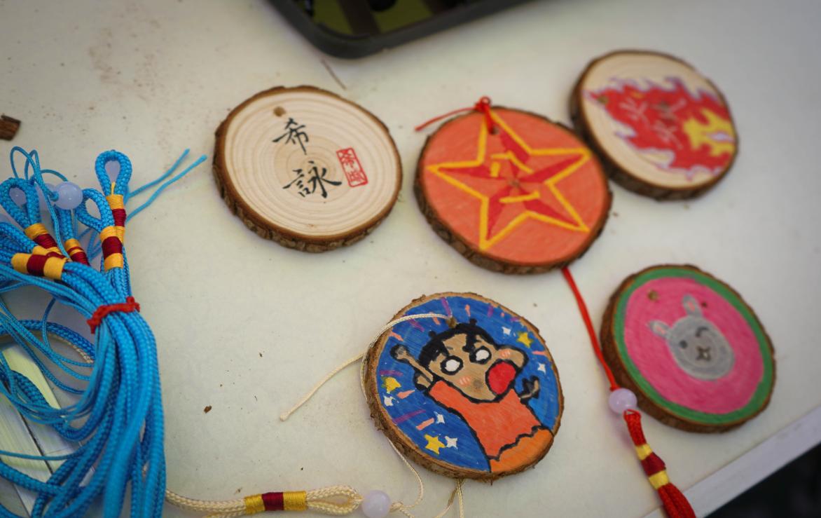 活动现场,同学们以废弃木材为创作载体,将环保理念融入创作,把废旧木料转化为承载创意与情感的年轮挂件。工作人员首先为同学们讲解了制作年轮挂件的流程、技巧以及其中蕴含的匠心精神和环保理念。随后,同学们手持缤纷的画笔,怀着对自然的敬畏之心,在木材切片绘制自己喜爱的图案、书写各种创意字体。绘制完成后,可选用工作人员提供的挂绳等材料进行装饰,完成挂件制作。从构思设计到绘画创作,从装饰美化到成品完成,每一个环节都凝聚着同学们的耐心与专注,挂件上的精美图案生动体现出同学们对创作的热爱和对匠心精神的传承与实践。