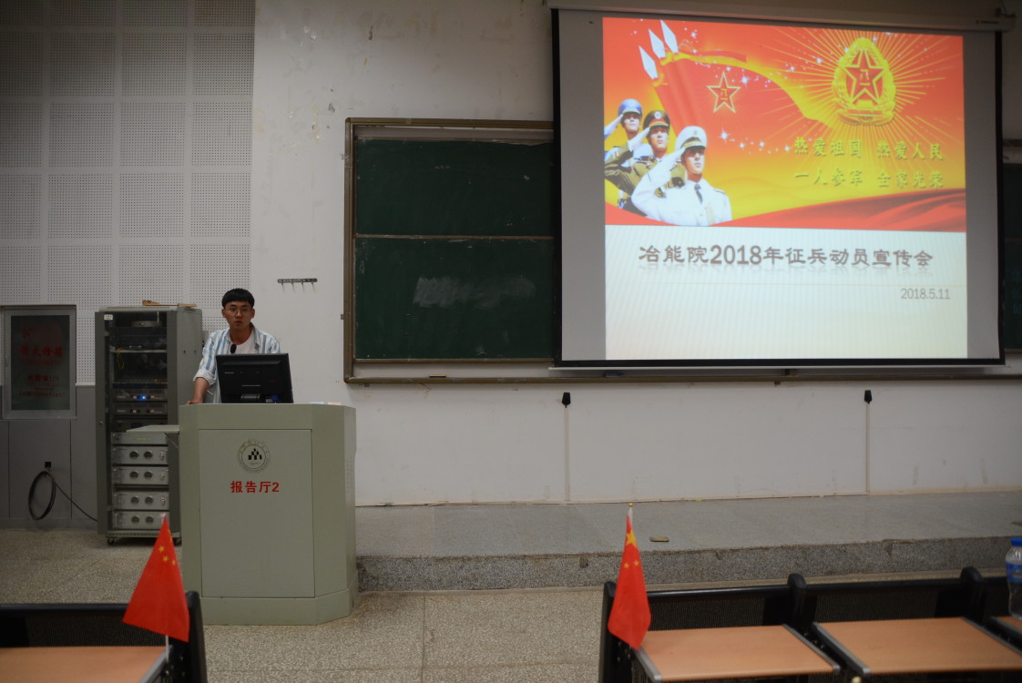 为鼓励学生积极参与应征入伍,提高兵员征集质量,推进国防和军队现代化建设,开展大学生入伍征集工作,冶金与能源工程学院应学校要求于2018年5月11日19 点,在呈贡校区中心教学楼100教室召开“征兵动员宣传”主题大会。本次大会由2016级辅导员张亚坤主持。