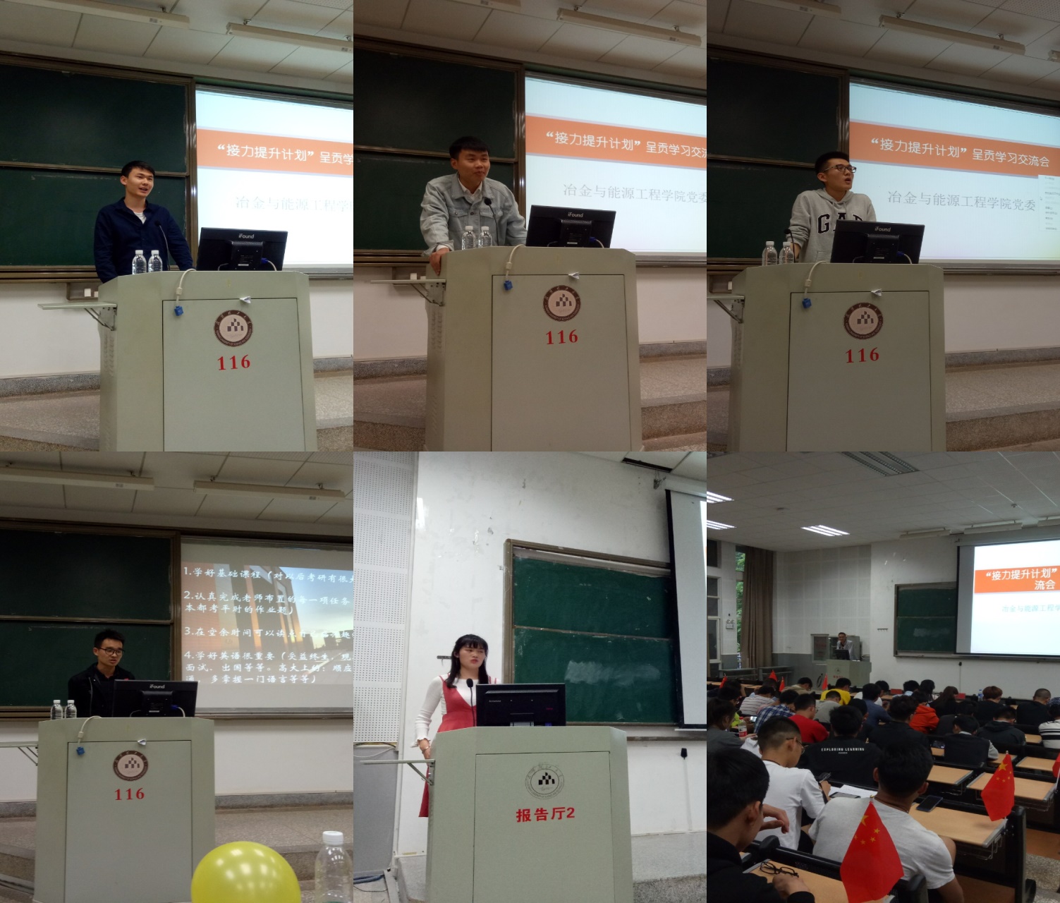 第一场交流会在陈杨健书记的激励人心的讲话中开始,陈书记鼓励低年级的同学要尽早下定考研决心,树立目标的学习目标,准确把握学习重点,素质教育的最高点就是继续学习;更要广泛的学习人文,学会发现生活中的温暖,有了丰富的人文底蕴,才可以战胜很多负能量。希望“接力提升班”的同学们发挥好模范作用,成为考研的主力军,带动更多的同学早着手、早行动,厚积薄发,考研成功。接下来由我们冶金专业的甘向栋、王立鹏、郑景强、韩嘉正四位同学依次上台与同学们分享考研学习的经验,这几位出色的学长纷纷强调,考研一定要下定决心,对自己充满自信,学好数学和英语是关键,提前做好准备,他们相信只要学弟学妹努力,一定可以考研成功。