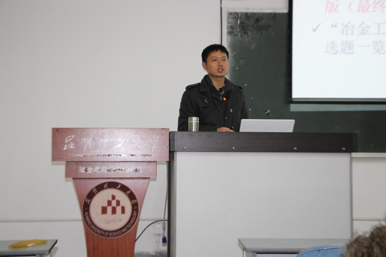 为了有效落实冶金与能源工程学院大四学生的毕业设计及毕业论文工作,确保设计及论文选题等相关事宜顺利实施。2017年12月19日晚,冶金与能源工程学院在基础楼200报告厅召开2014级本科冶金工程专业毕业设计及毕业论文选题指导大会。冶金系副主任黄帮福老师、学工办徐敏老师及全体2014级冶金工程专业本科毕业生参加了此次大会,大会由学工办徐敏老师主持。