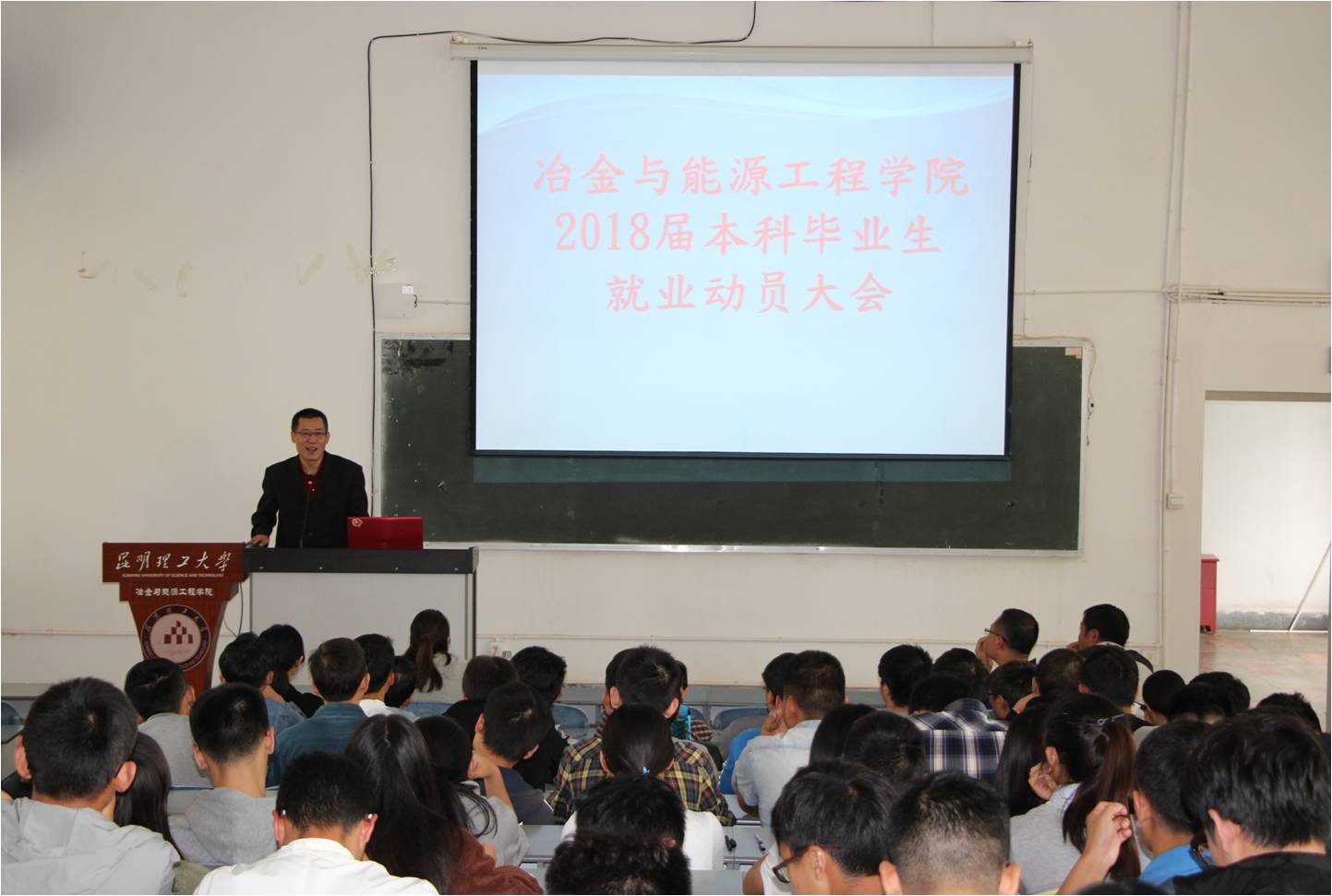 2018届本科毕业生就业动员大会在莲华校区基础楼200报告厅顺利召开,院党委陈杨健书记,新能源系、能动系、冶金系负责老师,学工办老师、毕业班专业导师以及魔镜号