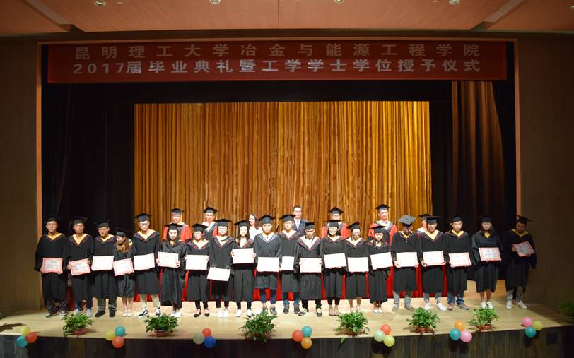 2017届本科生毕业典礼暨工学学士学位授予仪式在莲华校区伍集成会堂二楼演讲厅举行。校党委委员、院长马文会教授、学院党委书记陈杨健教授、党委副书记刘辉老师、副院长张利波教授、副院长谢克强教授、新能源科学与工程系主任包桂蓉教授、冶金系主任李兴彬副教授出席了毕业典礼,并为获得工学学士学位同学授予学位。学院党委副书记刘辉老师主持典礼暨仪式。
