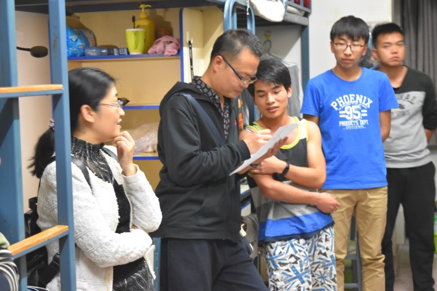 4月11日晚,学院教务办主任黄鑫老师、学工办主任于志强老师及学工办辅导员刘畅老师深入学生宿舍走访慰问2017届毕业生。