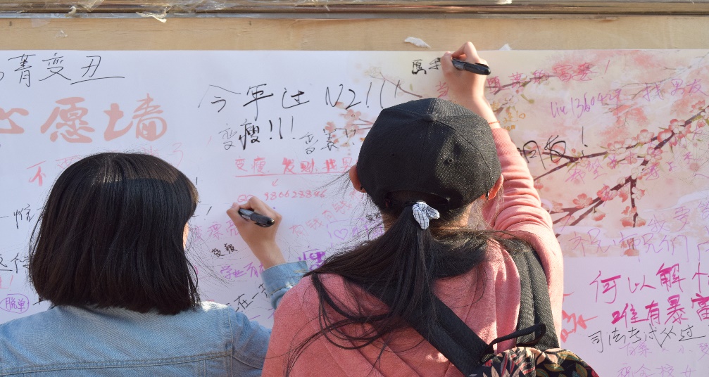 本次活动预计分为两天进行,在3月7日的活动中,主办方举行了“我的早餐”、“我的心愿”、“我的幸运”等多个精彩有趣的游戏。其中,“我的心愿”和“正话反说”两个活动受到了同学们的极大关注。在“我的心愿”活动中,同学们在“女生节心愿墙”上写上自己的心愿或粘贴便利贴,以署名或不署名的方式进行告白,同学们踊跃参与,短暂的活动收获的是纯真的友谊。在“正话反说”中,主持人说出成语或一句话,参与者则必须反着说一遍。有趣的游戏规则宛如一场头脑风暴,同学们一次又一次破解了主持人刁钻的题目。最终,第一天的活动在同学们的欢声笑语中结束了。
