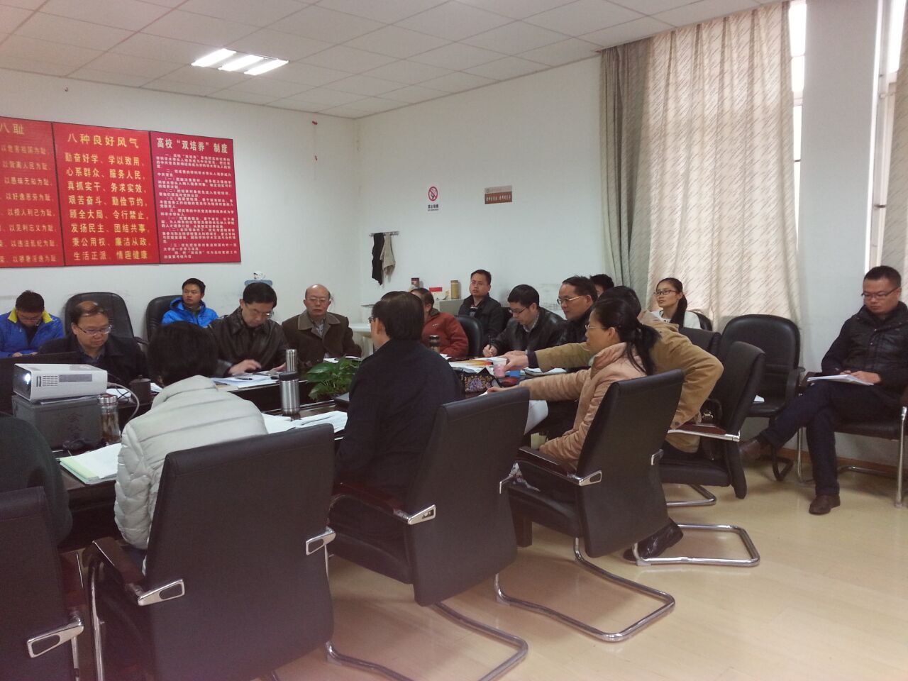 樊刚书记以PPT形式介绍了11月26日校评建促进会汇报内容,包括办学定位、师资队伍、教学资源、培养过程、学生发展、质量监控、自选特色项目,重点指出学院办学定位和学院特色项目存在问题。