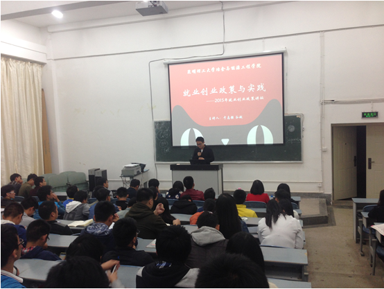 根据学校2015年度“毕业生就业创业政策宣传活动月”要求,为全面贯彻落实毕业生就业创业政策,进一步加大毕业生就业创业政策的宣传力度,向毕业生普及相关就业和创业的政策内容,2015年11月10日19点,冶金与能源工程学院在莲华校区基础楼200举办了“毕业生就业创业政策与实践”主题讲座。本次讲座是学校2015年“就业创业政策讲坛”的重要组成部分,由院学工办主任于志强老师和学院校友、创业典型代表谷越主讲,学院2016届本科毕业生参加了本次讲座。