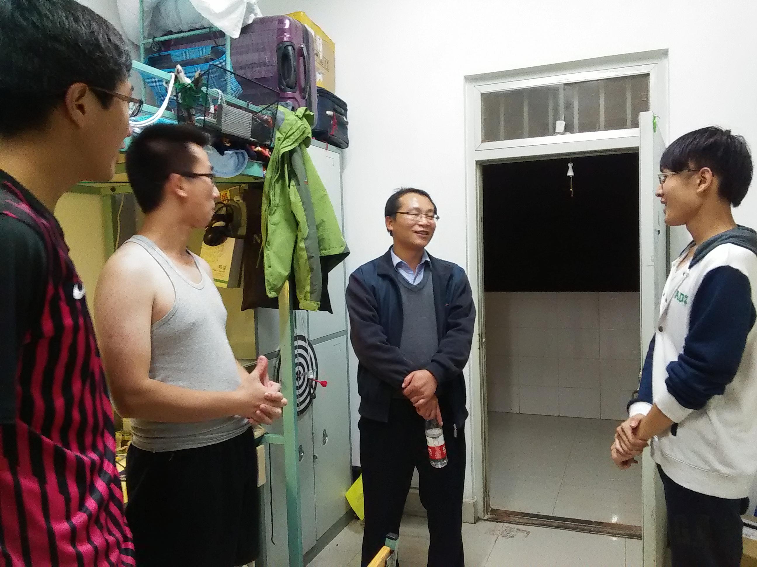 夜幕下的欢声笑语,在学子的寝室荡漾。樊刚书记一行来到寝室,面带平和的微笑与同学们交流谈心,此刻的他们是和蔼的师长,更是亲切的家人。他们从交谈中了解同学们在开学以来的生活和学习情况,鼓励同学们再接再厉,把更多的时间投入到学习和锻炼中去,力争做一名全面发展的大学生。不仅如此,他们也在问候中认真听取同学们反映的问题,并一一解答,让迷茫中的学子找到前进的方向,学院领导的关心对于同学们来说是惊喜,但更多的是温暖。
