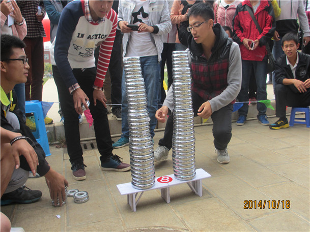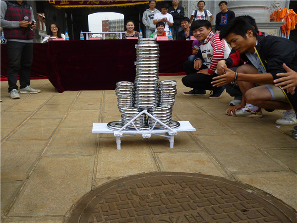 本次活动由共青团冶金与能源工程学院委员会主办,由冶金与能源工程学院团委科技协会承办,活动面向全校同学,以“承载重量,翱翔长空”为主题,旨在培养我校学子的学习和创新实践热情,丰富学生课余生活,激发学生的凝聚力和创造力。在活动现场,学校鹰眼俱乐部成员娴熟的航模遥控技术震惊在场的每一位观众,他们的热情随着航模飞行表演而愈发高涨。伴随着航模飞行的轰鸣声,纸桥结构设计大赛也拉开序幕,比赛分为承重组和美观展示组。美观组的作品构思巧妙,制作精美,每一个作品都吸引了所有在场观众的目光,依然记得第44号作品,利用黄金分割比,外形奇特,颠覆了桥梁的传统设计,创造出一个绝佳的桥梁,第47号的“钢铁之魂”桥,对称、立体、全“钢”型,更是完美地展现了纸桥的美。而承重组的比赛真正把大赛推向了高潮,当比赛桥梁一个个接受哑铃的重压时,全场无论选手还是观众都屏息凝神,观看着一个又一个奇迹的发生。最终第46组、49组荣获美观展示组优秀奖,冶能院陈军同学带领的第17组以绝对的优势获得了承重组一等奖。