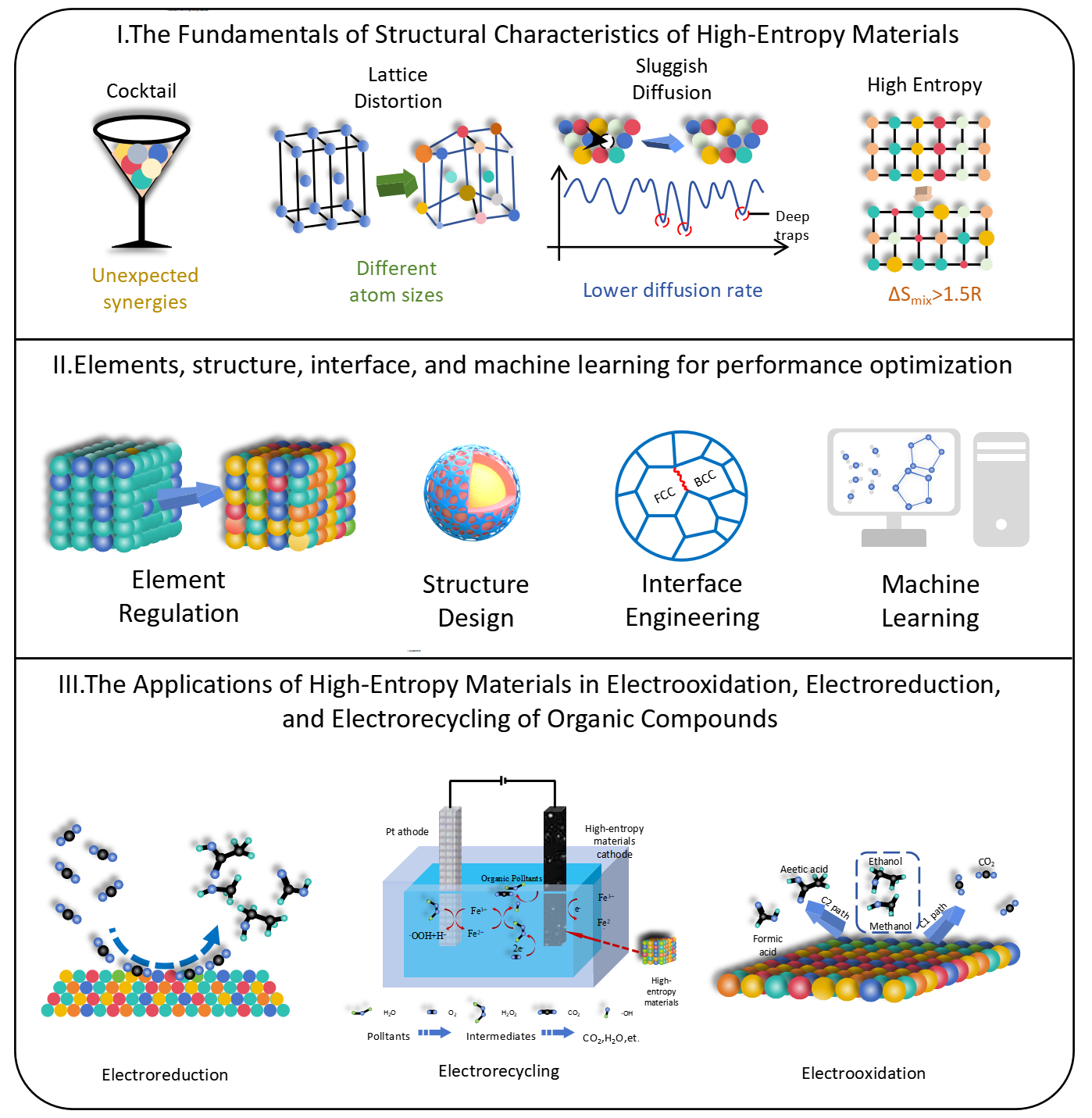 随着能源与环境问题加剧,有机废弃物难降解且危害大,传统化学转化需苛刻条件,能耗高且违背节能减排与碳中和目标;有机电催化因操作简便、效率高、环境友好,可实现有机物高效转化与资源能源回收。其中,高熵材料具有高熵效应、晶格畸变效应、缓慢扩散效应以及鸡尾酒效应,可以提升材料的活性位点密度、增加对毒性中间提的抵抗以及优化反应路径的选择。高熵材料可以根据组分、各元素含量以及结构来调整满足实际应用的需求,现阶段的研究重点集中在探究降低贵金属依赖以及追踪反应过程中活性位点的实时动态演化上,以降低合成成本以及探究其反应机制。