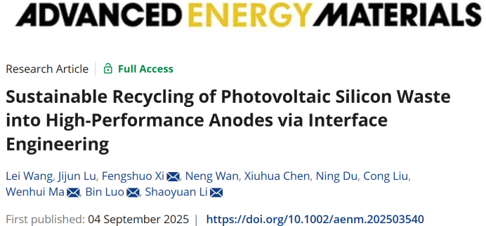 硅冶金与硅材料创新团队与澳大利亚昆士兰大学罗彬教授合作在国际知名期刊Advanced Energy Materials上发表题为“Sustainable Recycling of Photovoltaic Silicon Waste into High-Performance Anodes via Interface Engineering”的最新研究成果。