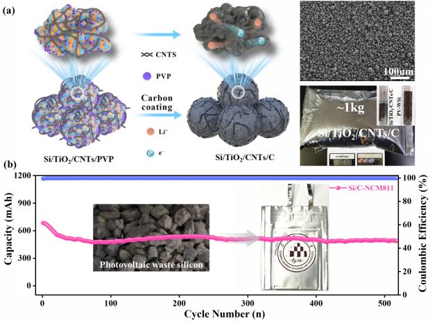 硅冶金与硅材料团队提出借助光伏硅切割废料独特二维结构特征,制备高性能硅基负极材料。通过砂磨构建起硅与二氧化钛(TiO2)的强界面耦合,借助刚性相界面粘附与载荷分担协同缓解体积变化,实现了高性能硅基复合材料的制备,所得Si/TiO2/CNTs/C复合材料振实密度达到 0.9 g·cm-3,组装的软包全电池能量密度达到 320 Wh·kg-1,并保持了优异的循环性能和倍率性能。研究团队在实验室实现了公斤级高性能硅基复合材料的制备,为光伏硅切割废料高值回用制备高性能硅基负极的可行性提供了新路径。