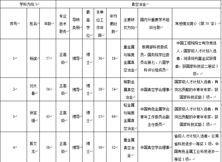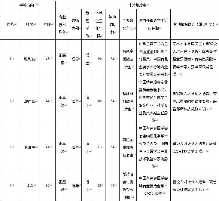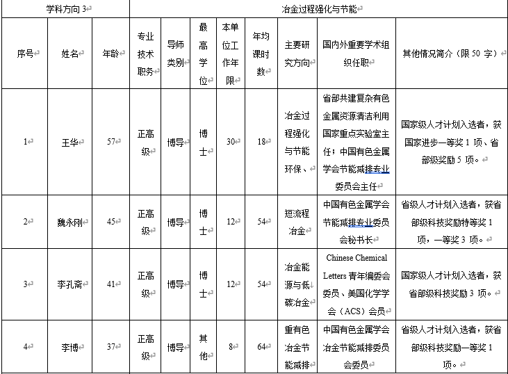 特色鲜明、实力雄厚。本学科立足我国西部地区,依托区位优势和有色金属资源储量丰富特色优势,形成真空冶金、非常规冶金、冶金过程强化与节能、新能源电池及材料、湿法冶金新技术5个特色学科方向,研究水平国际领先。现有专任教师146人,包括国家级高层次人才11人;拥有真空冶金、冶金节能减排等国家级创新团队3个、国家教学团队1个,省创新团队7个;建有省部共建复杂有色金属资源清洁利用国家重点实验室、真空冶金国家工程研究中心、复杂有色金属资源综合利用省部共建协同创新中心等国家级创新平台9个和省部级创新平台29个;建成干勇、何季麟、张文海、张懿等9个院士工作站。