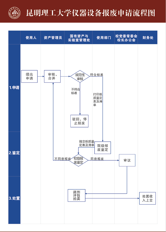 3、国有资产与实验室管理处对申报部门所提交的报废申请进行规范性审核。对不符合报废条件或达不到报废年限的固定资产原则上进行驳回处理。