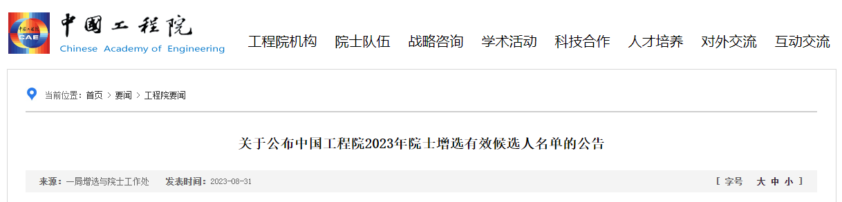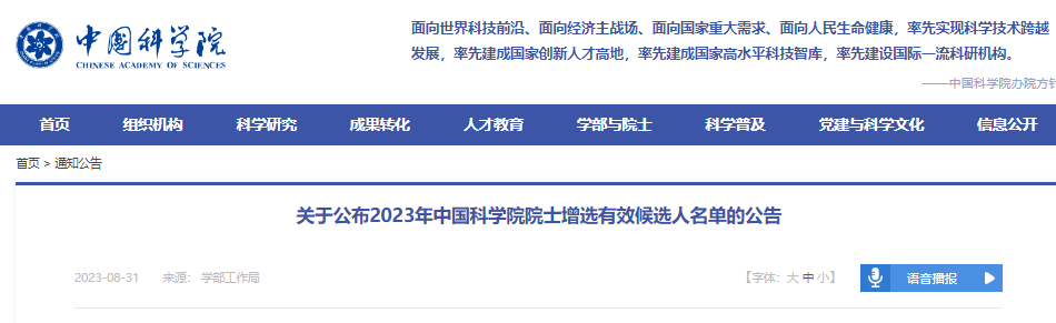 8月31日中国科学院、中国工程院网站发布《关于公布2023年中国科学院院士增选有效候选人名单的公告》《关于公布中国工程院2023年院士增选有效候选人名单的公告》
