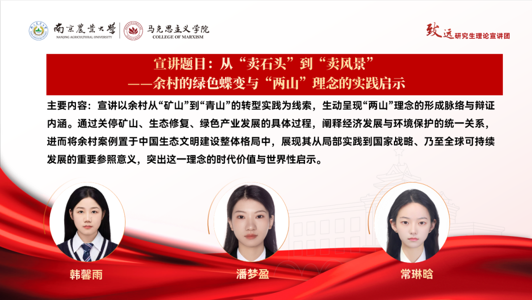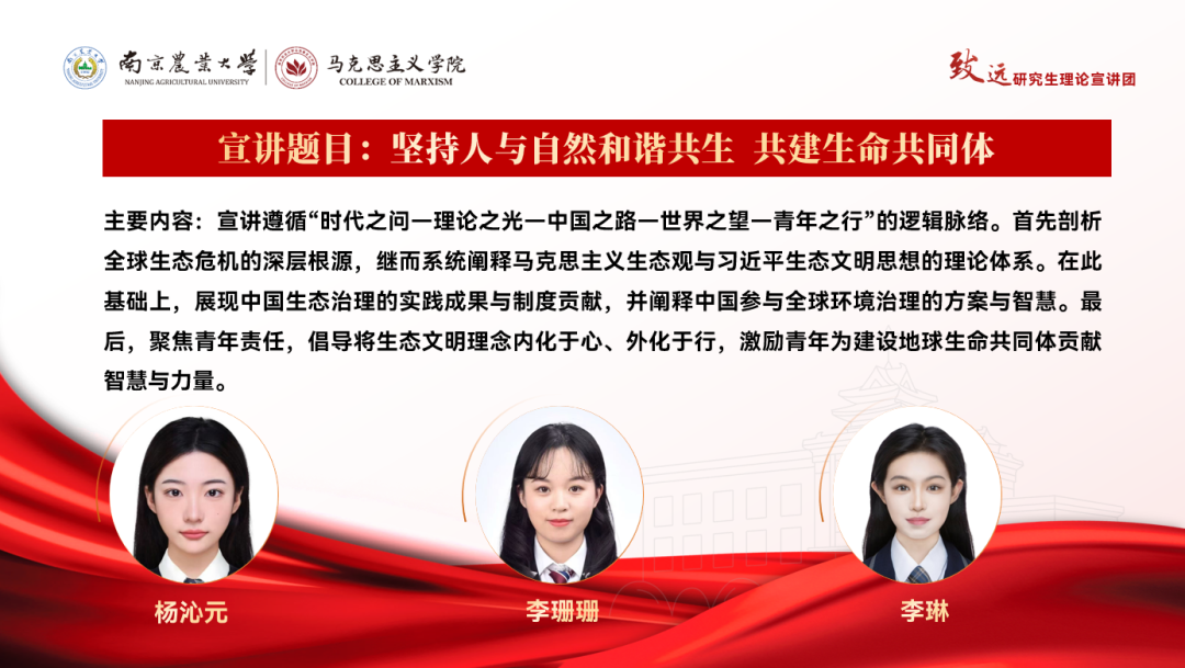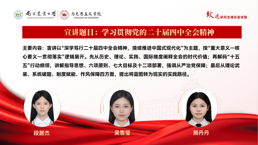 每一场宣讲都是一次思想的碰撞,每一次学习都是一份力量的积蓄。“致远”理论宣讲团带着满满的诚意与优质的内容,静待各学院的预约!让我们以预约为桥,让时代之声浸润校园,让奋进之力激荡人心,共同在强国建设、民族复兴的新征程上书写南农人的精彩答卷!