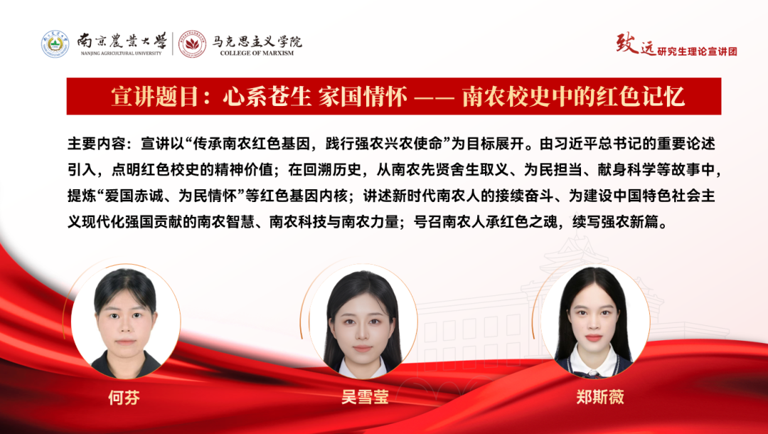 宣讲以“传承南农红色基因,践行强农兴农使命”为目标展开。由习近平总书记的重要论述引入,点明红色校史的精神价值;回溯历史,从南农先贤舍生取义、为民担当、献身科学等故事中,提炼“爱国赤诚、为民情怀”等红色基因内核;讲述新时代南农人的接续奋斗、为建设中国特色社会主义现代化强国贡献南农智慧、南农科技与南农力量;号召南农人承红色之魂,续写强农新篇。