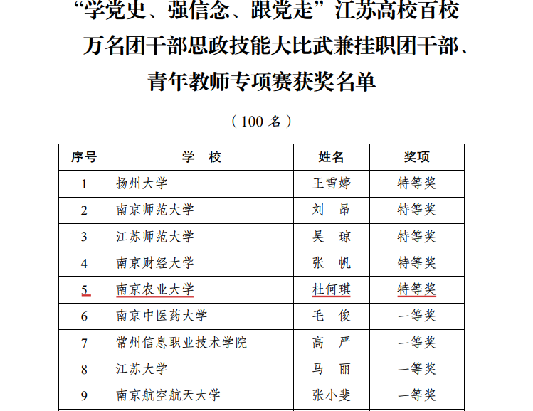 我院教师杜何琪在共青团江苏省委等部门举办的“学党史、强信念、跟党走”江苏高校百校万名团干部思政技能大比武青年教师专项赛中荣获特等奖。
