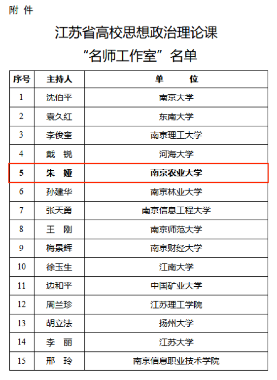 近日,中共江苏省委宣传部和中共江苏省委教育工委联合发布了《关于设立江苏省高校思想政治理论课“名师工作室”的通知》(苏宣通[2023]8号),由我院朱娅教授主持申报的工作室入选全省高校思想政治理论课“名师工作室”。首批全省高校思想政治理论课“名师工作室”共设立15个。